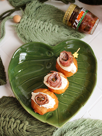 Dopo aver scolato le montanarine sulla carta assorbente, farcitele con una quenelle di crema alla robiola e completate con un filetto di alice con cappero. Procedete allo stesso modo con tutte le altre montanarine.
