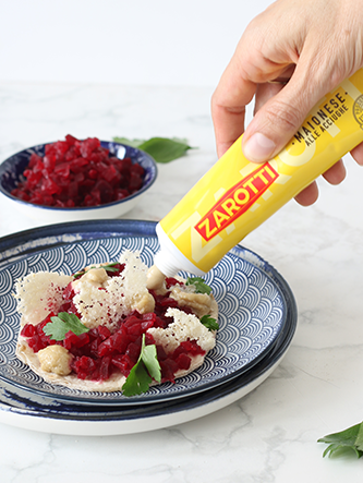 Farcite le piadine con la tartare di barbabietola, la Maionese di Acciughe, dei pezzetti di cialda di formaggio e del prezzemolo fresco. Servite come finger food.