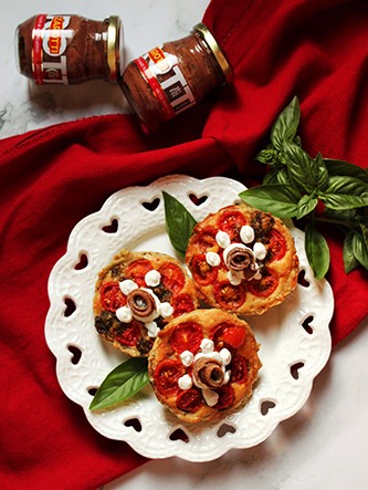 Riempite i gusci delle tartellette e completate con i pomodorini tagliati a metà (conditi in precedenza) e infornate a 190° (in modalità ventilato) per circa 20 minuti.